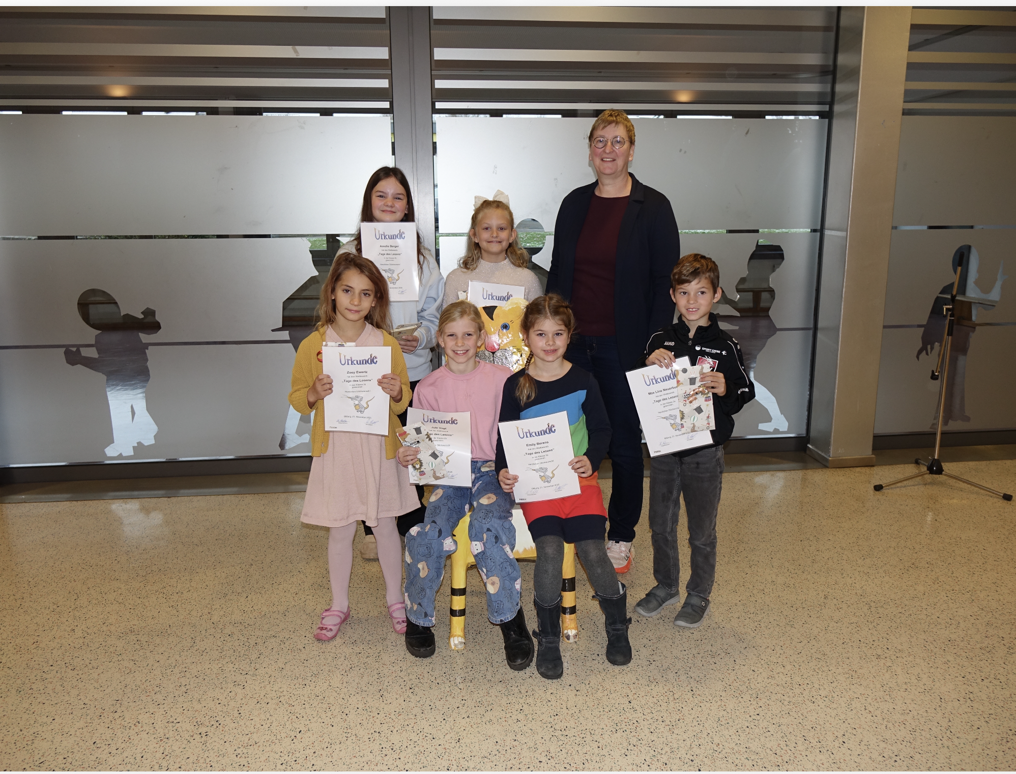 Noah Pardo Lorz 4b, Emil Mosbacher 3b, Marie Francois 2b, Max Neuerburg 2a, Sophia Franzen 3a, Lucy Berens 4a - in der Mitte Frau Kruppert (Rektorin)